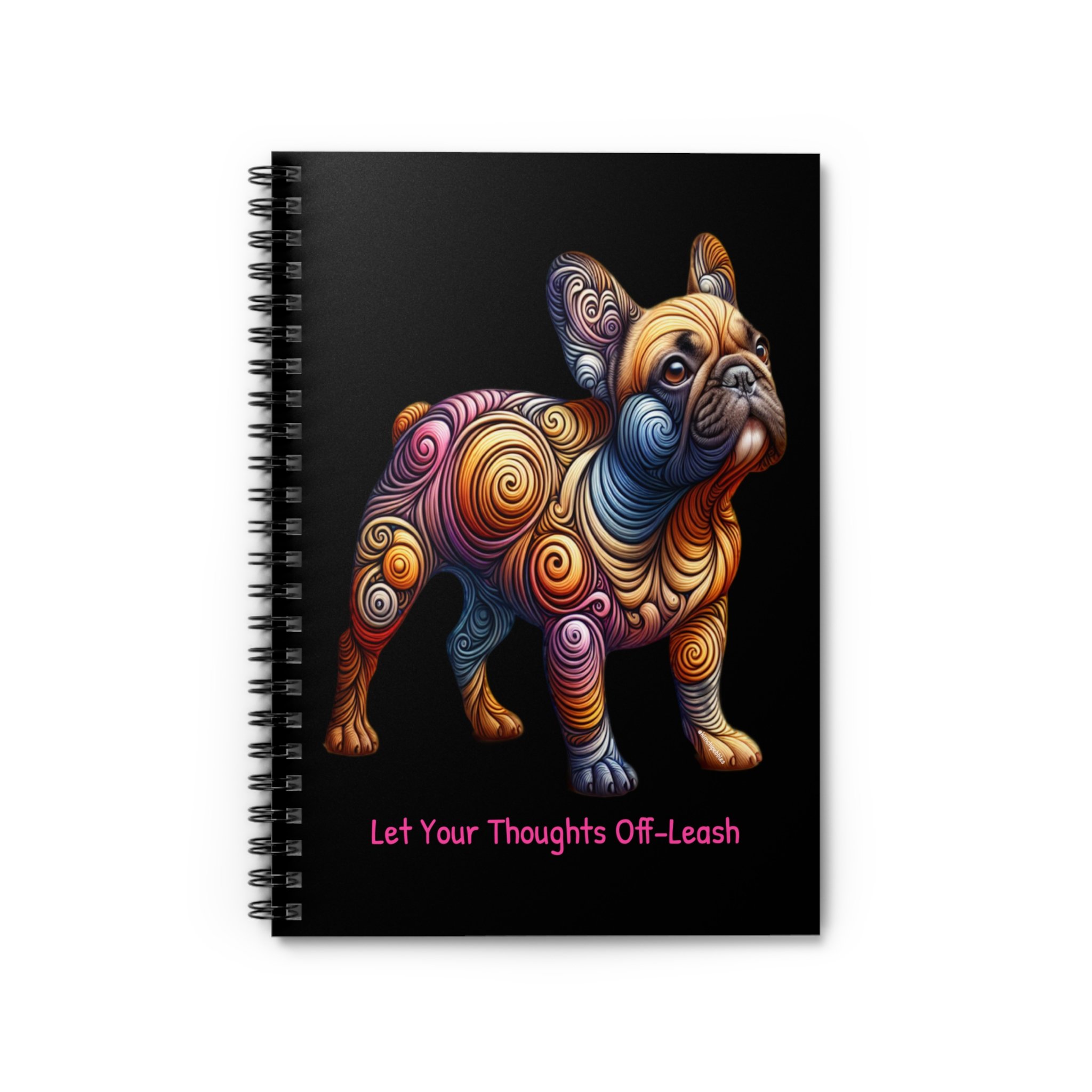 This spiral notebook is inspired by the Frolicking with Frenchies Coloring Book, encouraging you to Let Your Thoughts Off-Leash. Perfect for writers and creatives, this journal is great for jotting down ideas and thoughts. It features a fancy metal spiral for easy page removal, a document pocket for added storage, and 118 ruled line pages for writing. The 90gsm paper is ideal for writing, and the dark grey back cover adds a touch of sophistication.